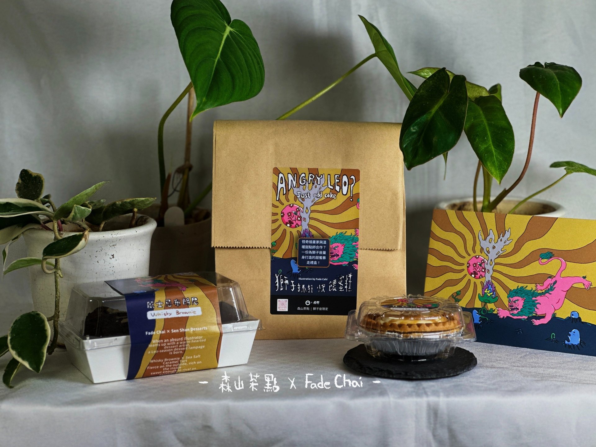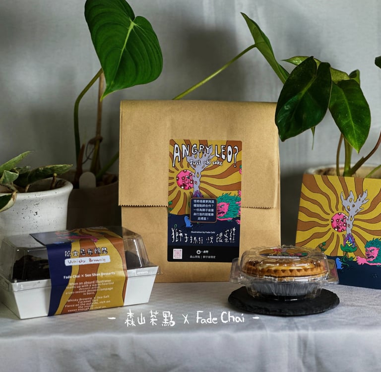 位鄉親!我們要來公布一個好消息,就是我和歸仁一起打球長大的朋友阿璋(他長到190我沒有)合作推出了獅子座限定禮盒! 原本上上個月就要做雙子座禮盒,但我很抱歉榨不出時間,雙子座的朋友再等等,但可以先吃獅子座的抵債XD 這次再接再厲終於如期推出了獅子座禮盒,我有認真的隨性畫了這幅獅子座Angry Leo,皇冠在花中燃燒冒煙,熱情的陽光,自信、樂觀的粉紅色...我也不知道我在寫什麼。總之買甜點組合就送明信片一張,明信片限量300張,送完可以再限量一次,但可能要等明年了! 內容物介紹: 👉威士忌布朗尼 👉焦糖海鹽塔 👉fadechai獅子座明信片 - 森山茶點 X 廢材Fade Chai -